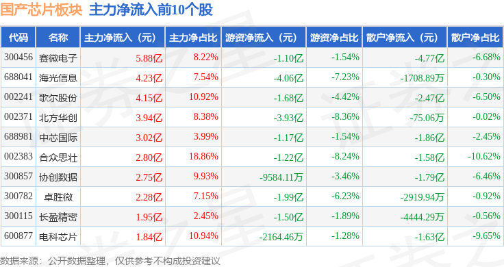 从资金流向上来看,当日国产芯片板块主力资金净流出38.65亿元,游资资金净流出1◇.7亿元,散户资金净流入40.36亿元▽。国产芯片板块个股资金流向见下表: