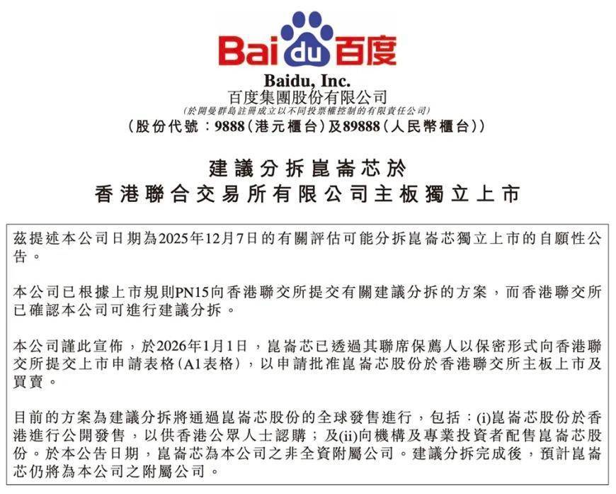 今日,百度集团发布公告,宣布其旗下AI芯片公司昆仑芯已于1月1日以保密形式向港交所提交上市申请表格(A1表格),以申请批准昆仑芯股份在港交所主板上市及买卖。