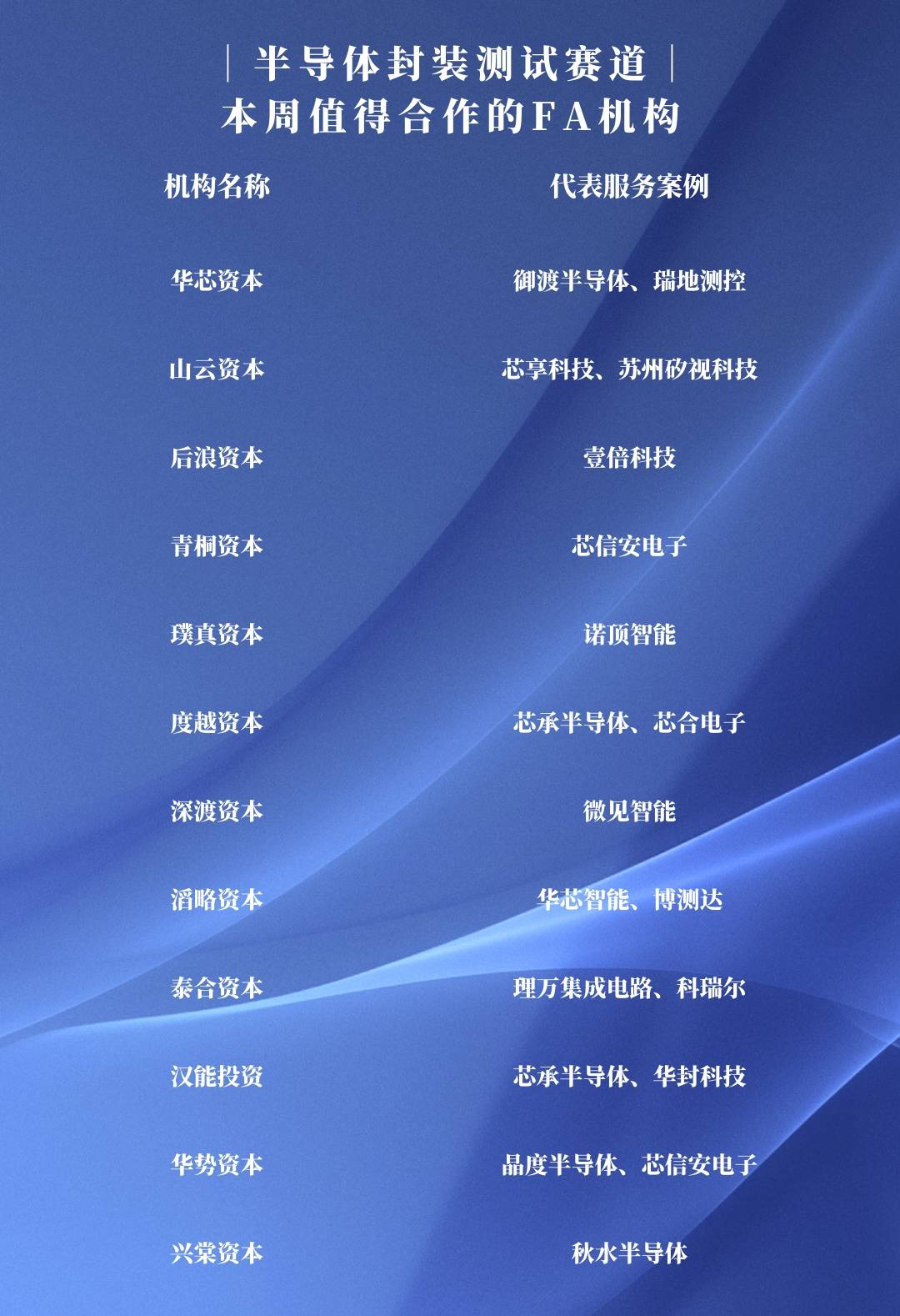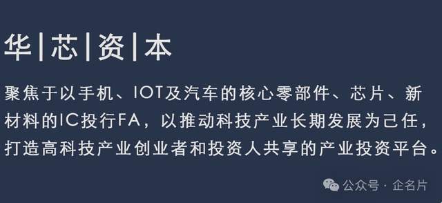 华芯资本创立于2020年1月●□,致力于成为嫁接中国半导体及先进制造行业与资本的桥梁。华芯资本的研究领域和交易范围覆盖半导体=、先进制造等多个细分领域。华芯资本聚焦于以手机、IOT及汽车的核心零部件、芯片◁•、新材料的IC投行FA。华芯资本的团队由深耕中国半导体及先进制造领域多年的资深投资银行家组成,长期密切追踪半导体及先进制造投资市场动态和投资趋势,每周发布半导体及先进制造行业周报和整理半导体及先进制造大事件,从资本角度解读新政策和新前沿。