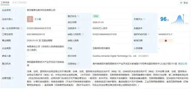 2026年1月1日■▲◇,贵州爱茅台数字科技有限公司(以下简称“贵州爱茅台■●▽”)在贵阳正式注册成立,由贵州茅台酒股份有限公司(以下简称“贵州茅台◆•-”)全资持股▪□,注册资本高达6亿元。