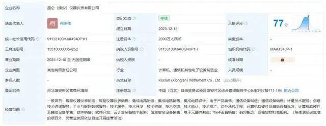 2025年12月18日◇▲,昆仑(雄安)仪器仪表有限公司(以下简称“昆仑仪器仪表▽▽□”)正式成立=○,注册资本2000万元。