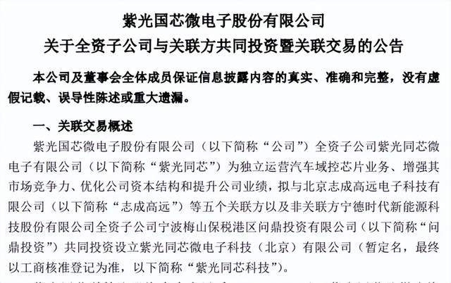2025年12月25日▪▽-,紫光国芯微电子股份有限公司(以下简称□□“紫光国微”)发布公告称,其全资子公司紫光同芯微电子有限公司(以下简称▲◇“紫光同芯”)为独立运营汽车域控芯片业务,拟与五家关联方及一家非关联方共同投资设立紫光同芯微电子科技(北京)有限公司(暂定名,最终以工商核准登记为准,以下简称“紫光同芯科技”)=□☆。