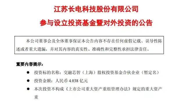 此外,在同日,长电科技发布公告称,其全资子公司上海云鲛龙企业管理有限公司拟参股设立交融芯智(上海)股权投资基金合伙企业。该投资基金总规模达13.46亿元◆,云鲛龙拟认缴出资4.038亿元,占投资基金30%的份额。