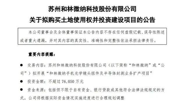 2026年1月5日,苏州和林微纳科技股份有限公司(简称●◁▪“和林微纳□■=”)发布公告▪◁,宣布拟投资不超过7•.605亿元建设■●“手机光学镜头组件及半导体封测业务扩产项目”,核心聚焦提升半导体芯片测试探针等封测相关产品产能与市场竞争力,以响应高端制造业及半导体产业发展需求◆◁=。