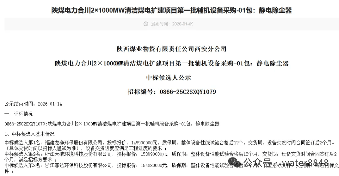 2026年1月9日,陕煤电力合川2×1000MW清洁煤电扩建项目第一批辅机设备采购-01包◇▷●:静电除尘器中标候选人公示▽△□。