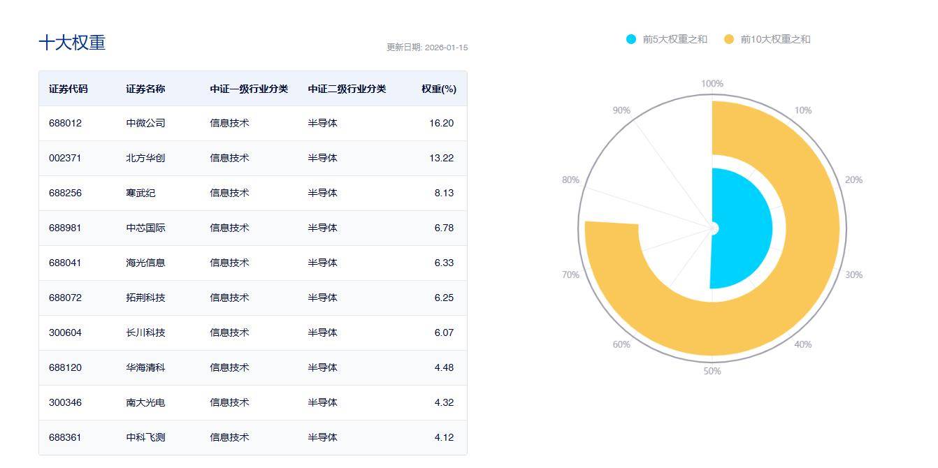 既有像北方华创(全能型设备巨头)☆-☆、中微公司(刻蚀机领军者)这样的设备底座,也纳入了海光信息、寒武纪等代表中国AI算力最高水平的芯片公司。这种高度集中的持仓结构,使其成为分享半导体设备行业增长的高纯度工具。