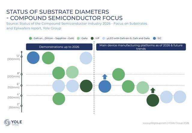 受市场需求和供应链中新一轮技术成熟度提升的驱动,碳化硅(SiC)衬底正从6英寸(150毫米)向8英寸过渡,而磷化铟(InP)衬底则向6英寸过渡。预计蓝宝石衬底上的氮化镓(GaN)和砷化镓(GaAs)的主要制造平台仍将维持在6英寸,而镓基微型LED衬底仍将维持在4英寸。虽然已有12英寸晶圆的早期演示,但这些晶圆短期内不太可能进入市场。