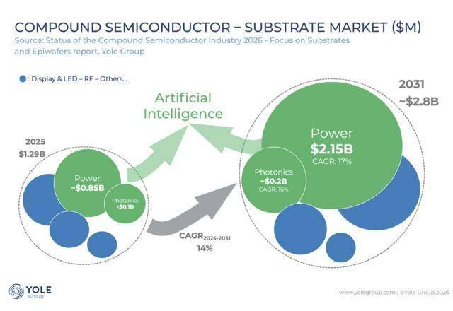 化合物半导体器件的日益普及在衬底层面得到了清晰的体现,该领域的投资正在不断扩大。Yole Group在其最新报告中预测,2025年至2031年间,整个市场将以14%的复合年增长率增长,规模将从13亿美元增长至28亿美元,增长超过一倍。